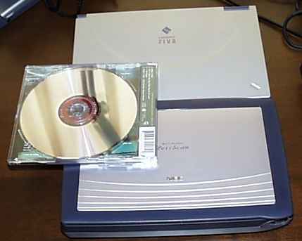 とりあえず、モバイルPCと一緒に並べてみました。全く同じサイズです。またまた比較用にCDも並べてみました。
